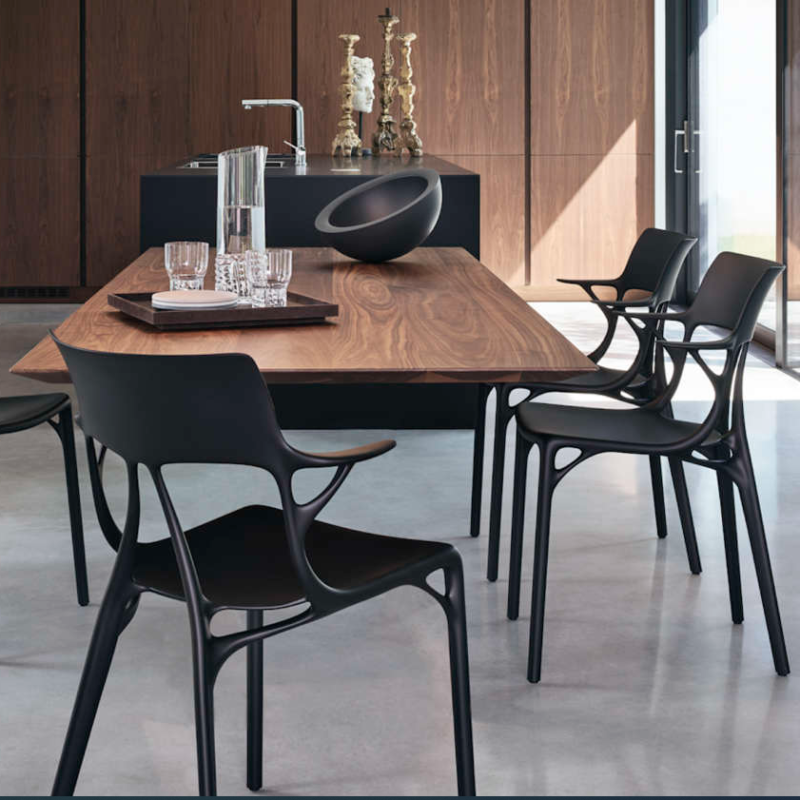 The A.I. is Kartell’s first chair created from 100% recycled material. Aesthetics and structural requirements remain unaltered, blending seamlessly with generative design. This chair is crafted from 100% recycled thermoplastic technopolymer. Sourced from production scraps, this process restores life to unused industrial material.