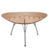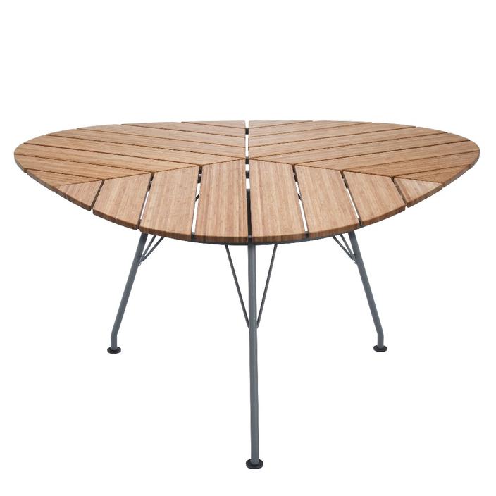 LEAF dining table for outdoor use, triangular size 146 x 146 x 146 cm, with tabletop lamellas in sustainable bamboo and leg construction in grey powder-coated steel. A beautiful garden table that really looks like a leaf.