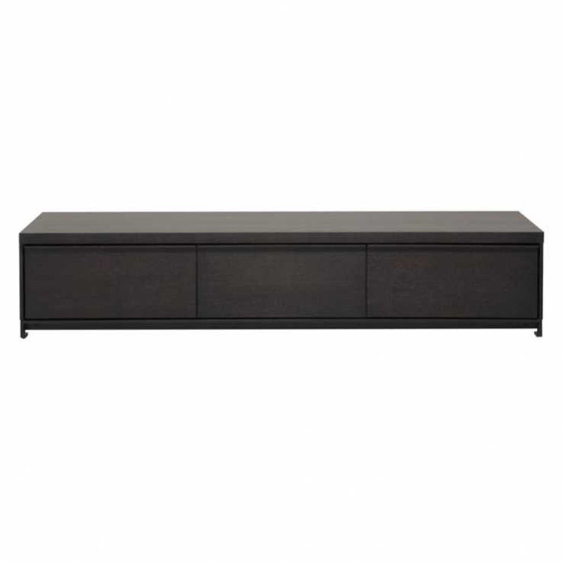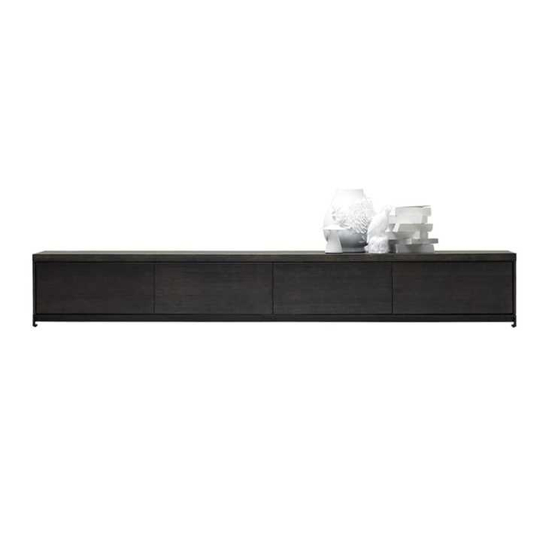 Comprised of oak veneer stained in a dark grey finish, two central pull down cupboards with soft close drawers either side and Matt black steel handles, base rail and legs