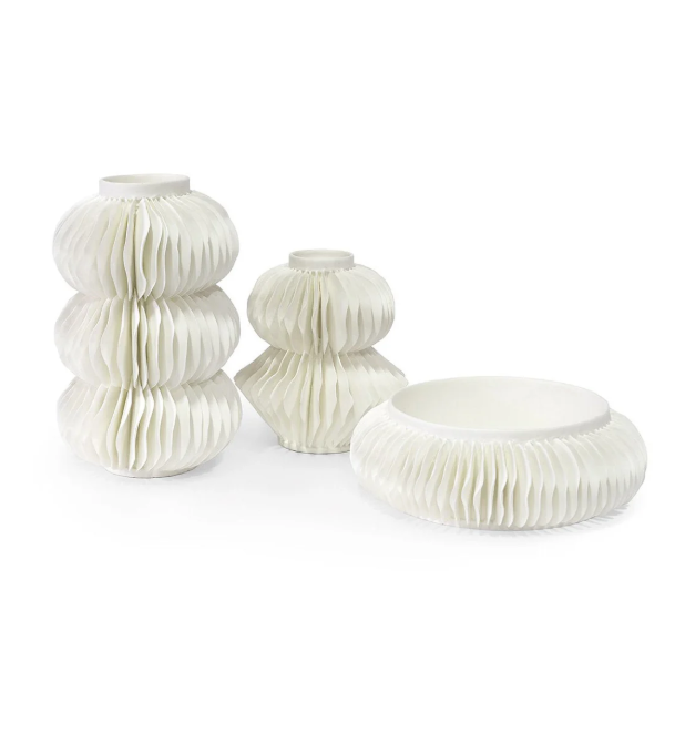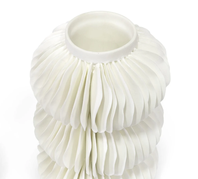 Vase is made of fine bone china in a white finish. Bone china is a durable form of porcelain composed of clay, bone ash and other minerals.
