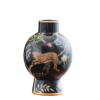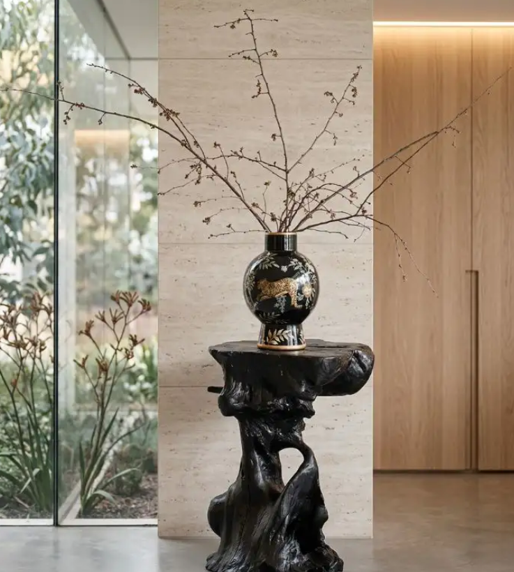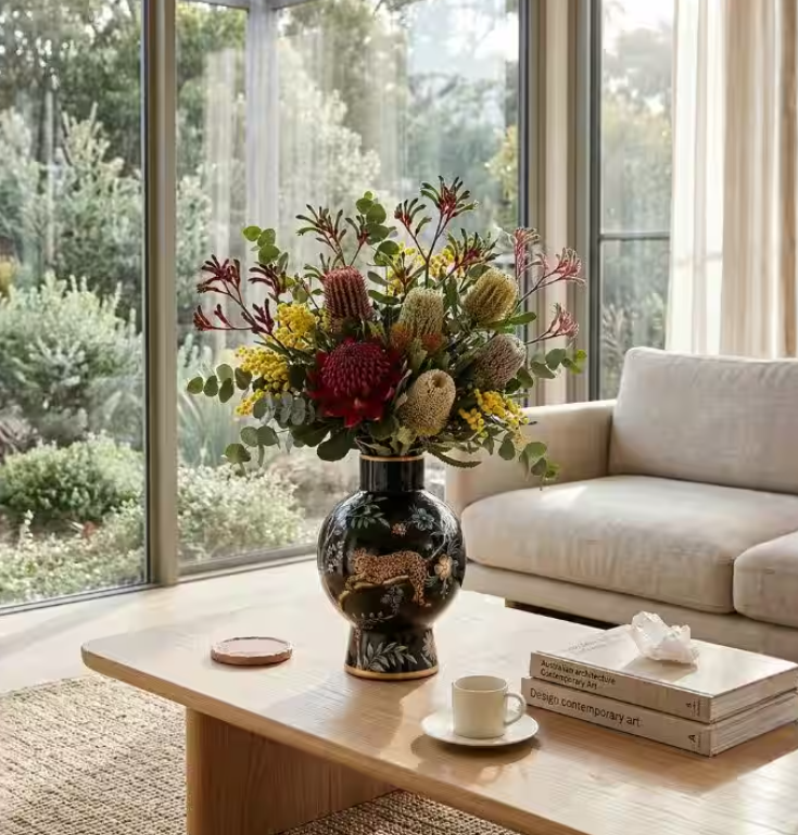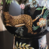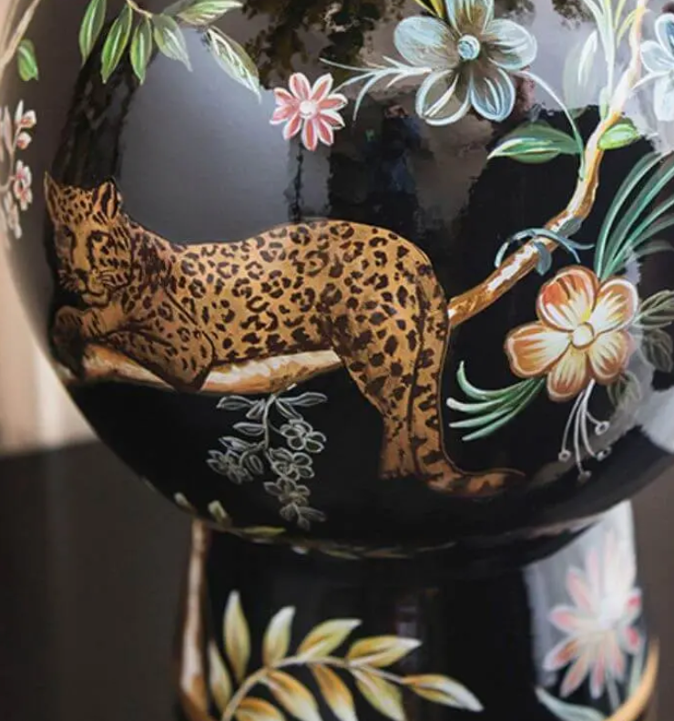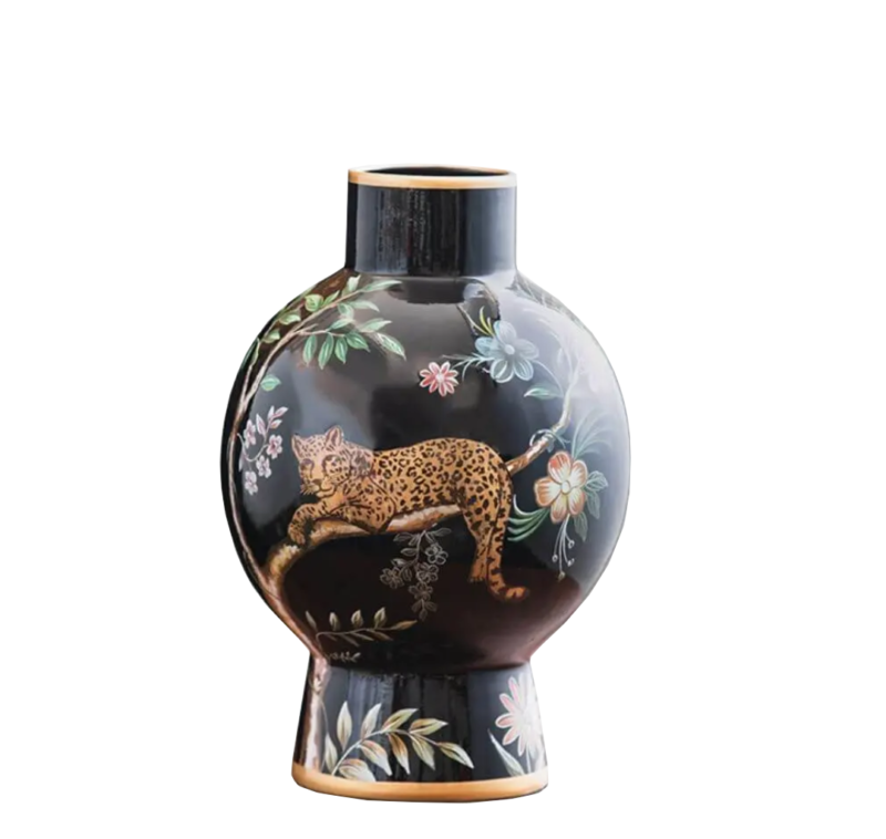 The elegant bulbous silhouette draws inspiration from classical Chinese porcelain forms, while the contemporary hand-painted design bridges traditional techniques with modern aesthetic sensibilities. The rich colour palette of deep charcoal, warm golden tones, and soft botanical hues creates a striking focal point that enhances both contemporary and traditional interiors.