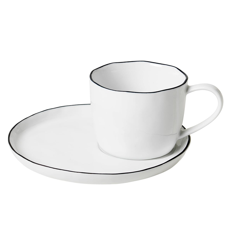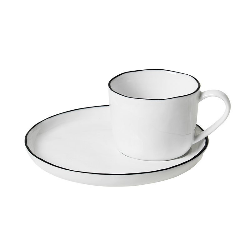 Elegant shapes and soft tones, inspired by the natural mineral salt. The black hand painted brim makes every piece unique. The glaze is very sensitive to conditions of the firing, which results in varying textures and colours