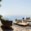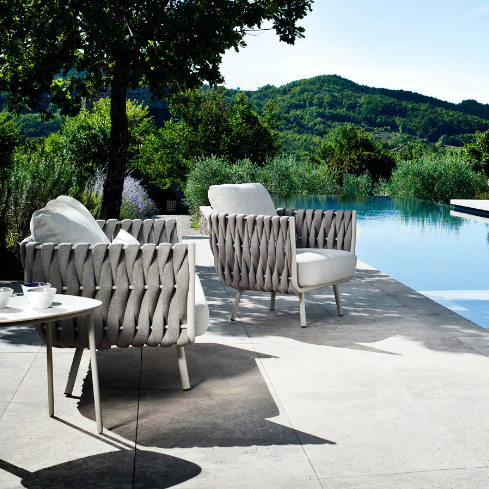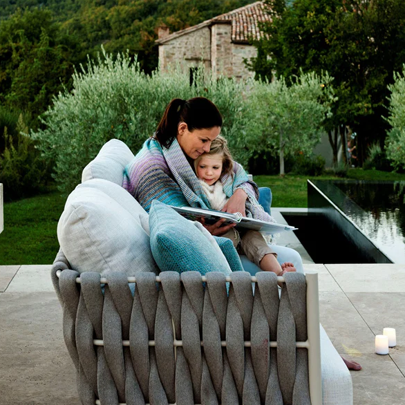 The Tosca outdoor sofa by renowned international designer Monica Armani is simultaneously warm and inviting, stylish and intriguing. Rounded forms, tapered legs and an elegant seating shell in powder-coated stainless steel, upholstered with extra-wide braiding.