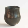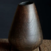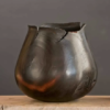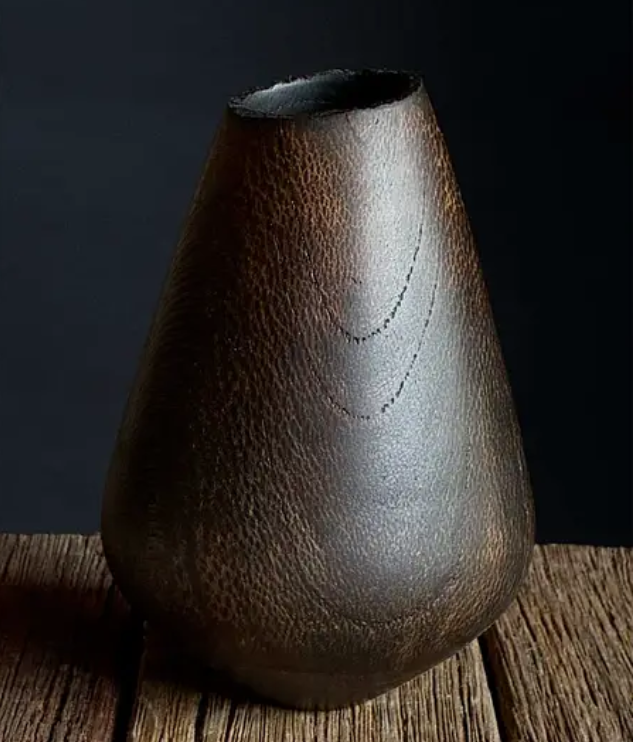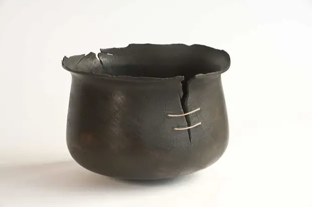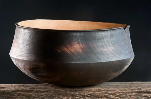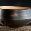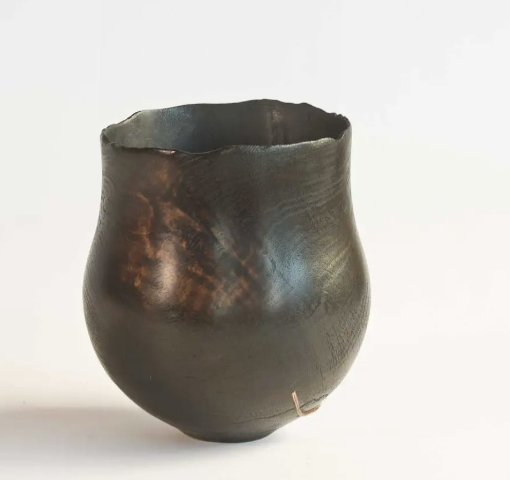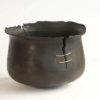 This large open vessel is carved from taraire, with a blackened surface that emphasizes both texture and form. The cracked rim is a striking feature, repaired with hand-beaten copper, turning the restoration into a celebration of resilience and imperfection.