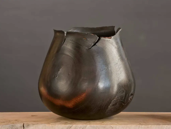 The combination of burn marks, natural grain, and copper repair creates a powerful vessel with a sense of history and character. Its sculptural presence and tactile quality make it a compelling statement art piece.